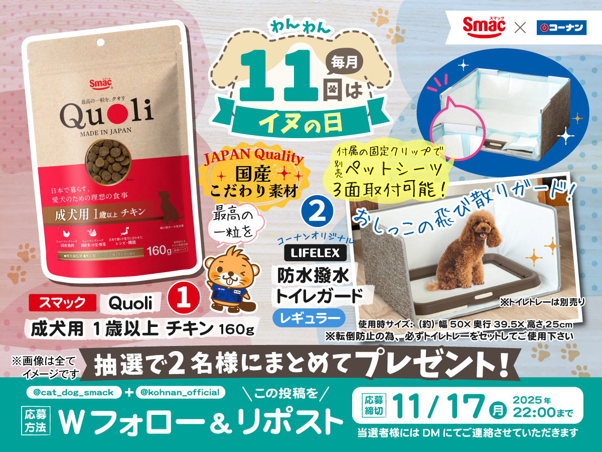 🐕 #イヌの日 11月スペシャルキャンペーン 🐕 毎月11日は「イヌの日」🐶🌸 スマックさまからは新工場で生産されたペット思いの新フードが登場🥰🐕 ✅応募方法 ①@cat_dog_smack と@kohnan_official をフォロー ②この投稿をリポスト ✅締切 2025/11/17(月)22:00 ✅規約 hc-kohnan.com/pre/pdf/202511… pic.x.com/Aj9GAQRRZb x.com/cat_dog_smack/…